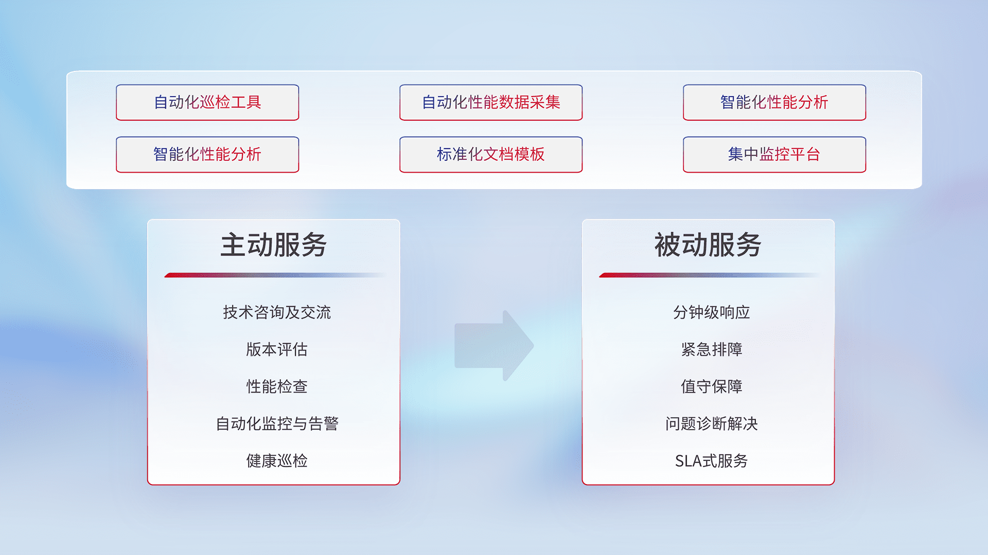 智能化工具和标准化文档,,,,保障服务质量,,提供主动服务(包含技术咨询、、、版本评估、、、性能检查、、自动化监控与告警、、健康巡检)和被动服务包含(分钟级响应、、、紧急排障、、、、值守保障、、、、问题诊断解决、、SLA服务)。。。。